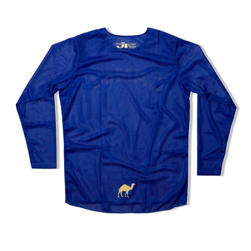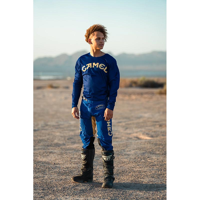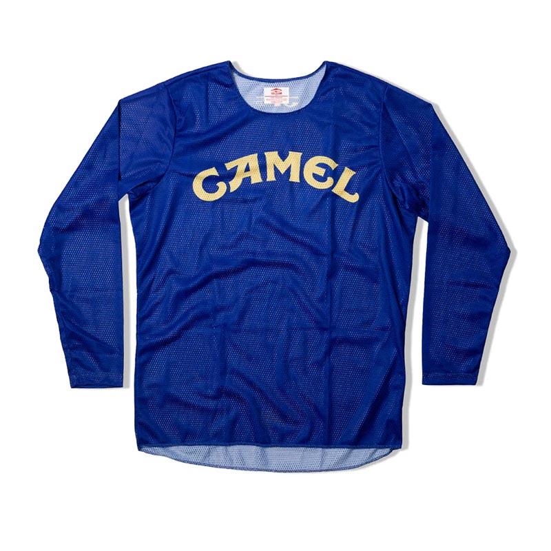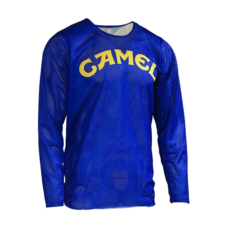 Ce jersey motocross ne joue pas la discrétion. Le bleu Camel, emblématique, capte immédiatement le regard et renvoie à toute une culture racing profondément ancrée dans l’histoire du MX.